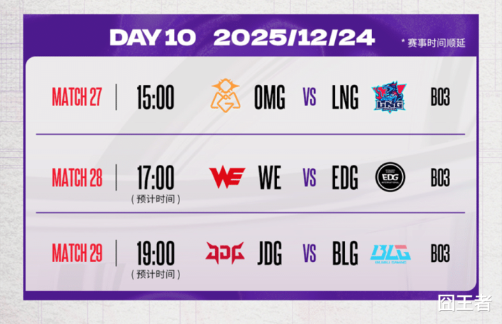 12月24日,三场比赛由OMG对阵LNG,WE对阵EDG,以及重头戏JDG对阵BLG带来。他们谁又会笑到临了呢,让咱们翘首跂踵。
