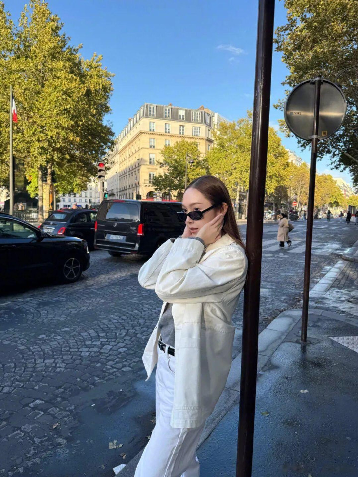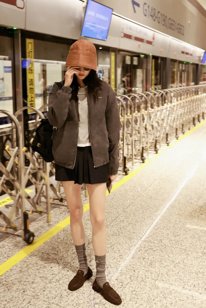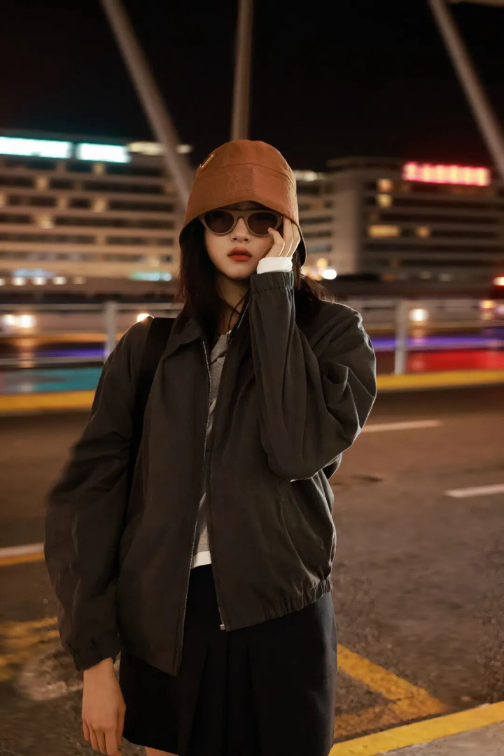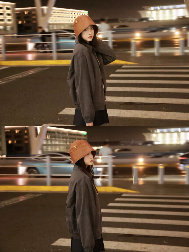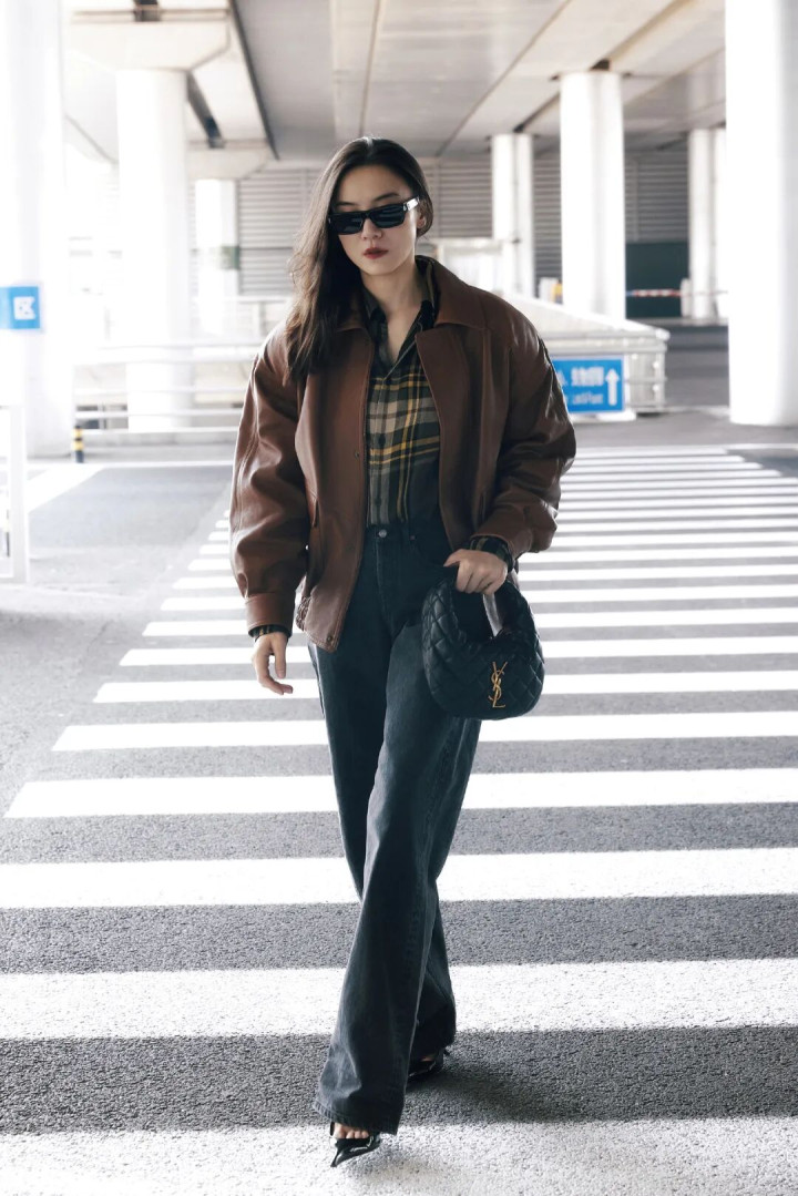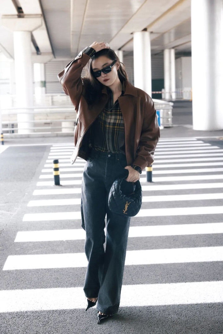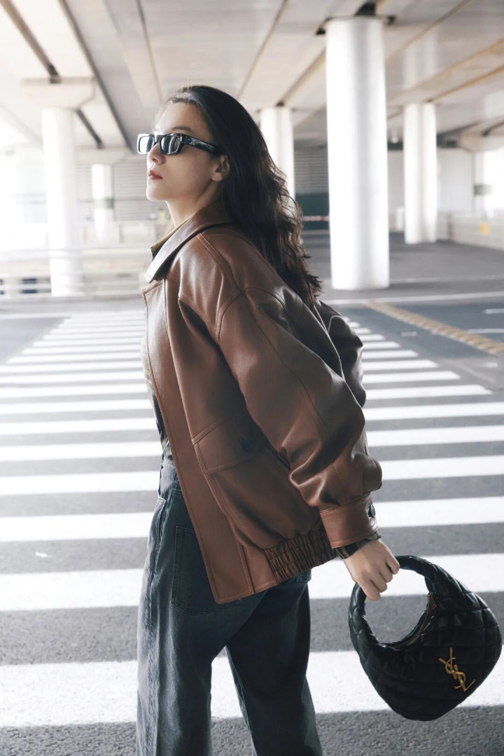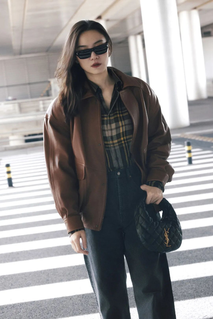 宽大的棕色皮衣搭配牛仔裤+尖头高跟鞋,中性与女东说念主味会通起来。墨镜一戴气场全开,超脱中带着即兴韵味,走出了大女主的飒爽姿态。
