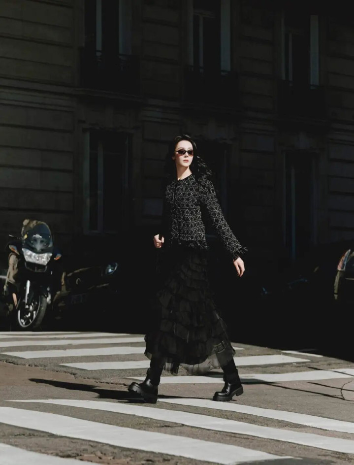 粗花呢材质的玄色短款小外衣,带有空洞的银线纹理,旯旮还作念了流苏毛边缱绻,看起来邃密无比贵气。搭配细微的网纱材质裙装,重重叠叠的缱绻增多了柔好意思感,和硬挺的外衣酿成刚柔对比,甜酷均衡得刚好。