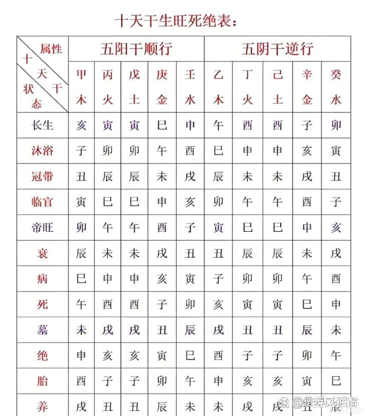 一般来说,在子平法的测算中,用“阳顺阴逆”分开判断的交替,但阴干也要同期参考五行自己的十二永生,也即阳干的永生,判断起来就更复杂些。