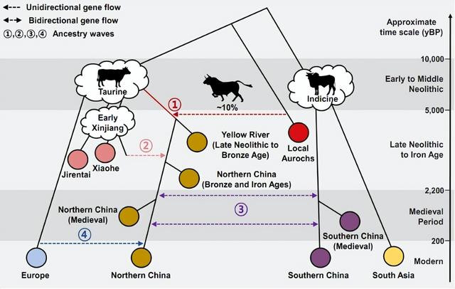 距今约5000年前的新石器时间晚期,普通牛传入黄河流域并与原土野生原牛发生基因疏通;新疆地区的早期家牛受到西亚普通牛和南亚瘤牛的共同影响,自青铜时间晚期至铁器时间握住向黄河流域渗入,持续影响了中国朔方家牛的遗传结构。而铁器时间至明清时期,南朔方牛群则进一步和会,最终奠定了现今中国南朔方家牛的基本遗传框架。